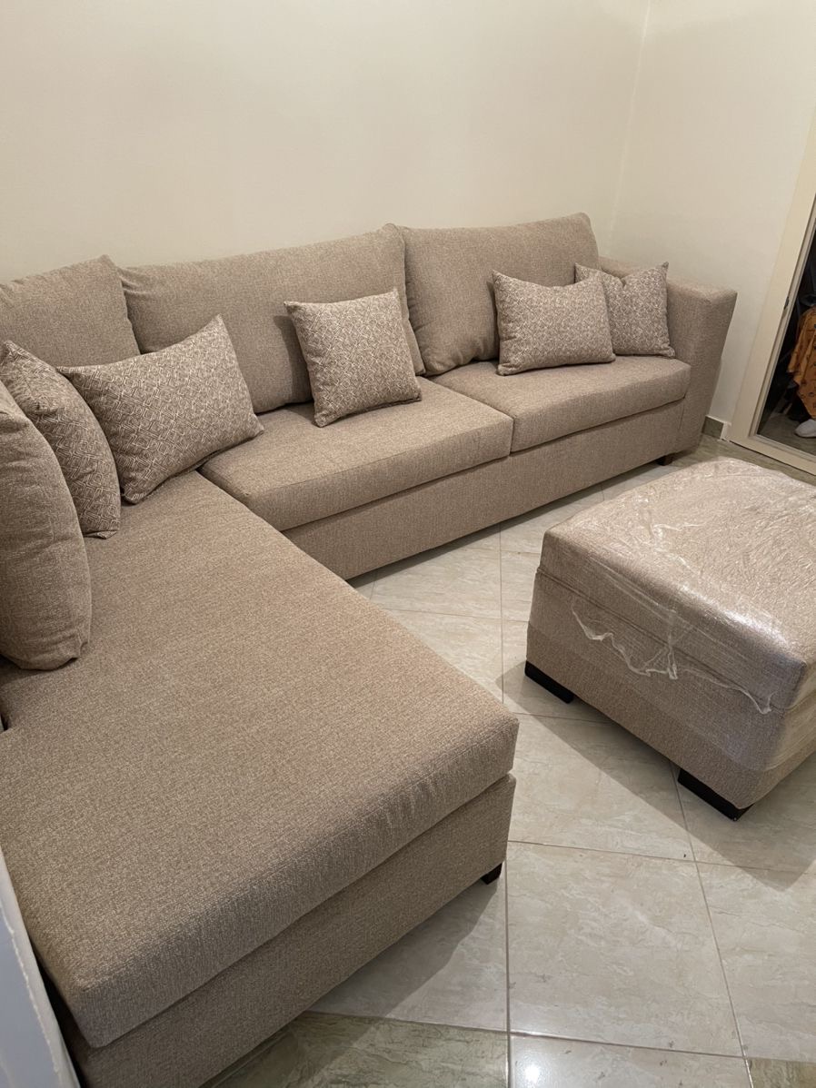 An L-shaped sofa offers a spacious and stylish seating solution, with a versatile design that fits into corners or open spaces. Perfect for lounging or hosting guests, it combines comfort with modern aesthetics.